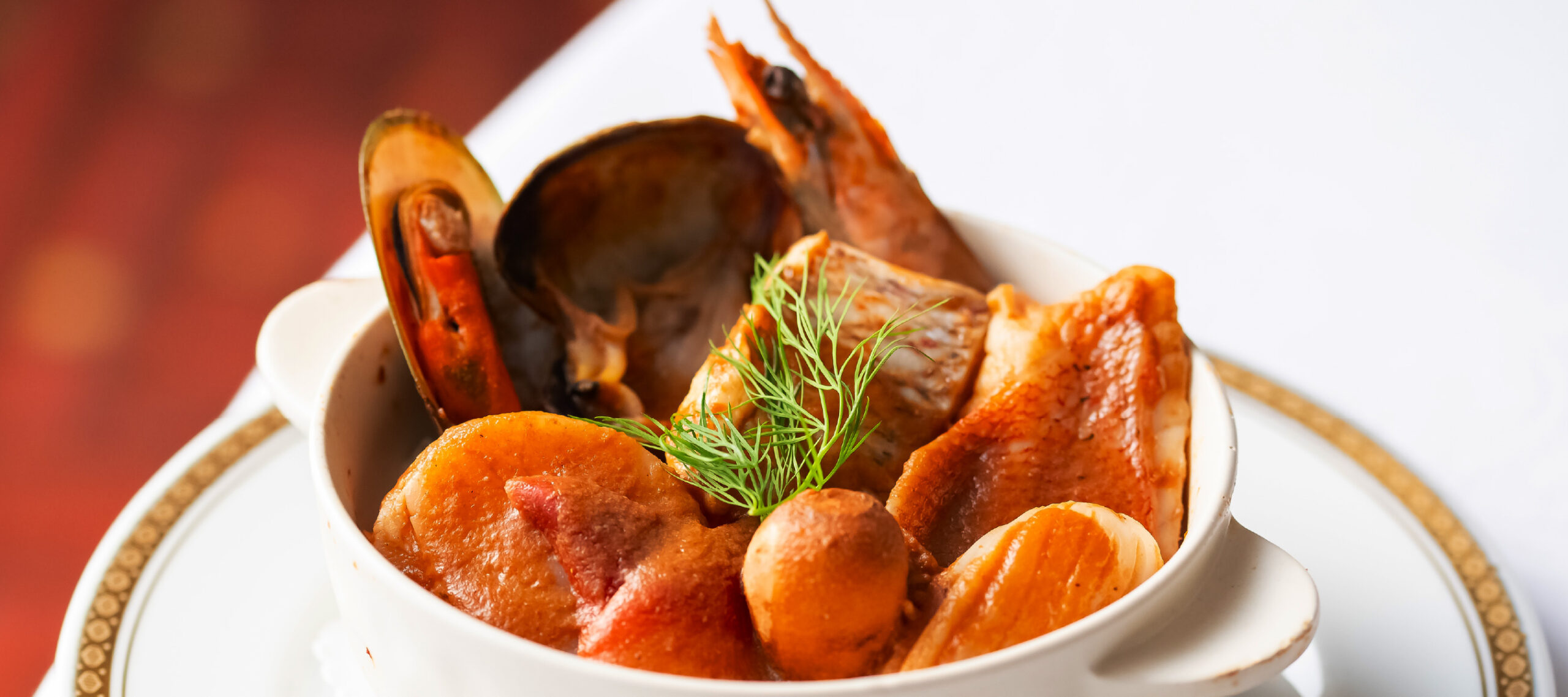 当ホテル伝統のモクズガニベースのスープと八戸港に水揚げされた魚介類を含む8種類の具材の個性を楽しんでいただけるブイヤベースです。