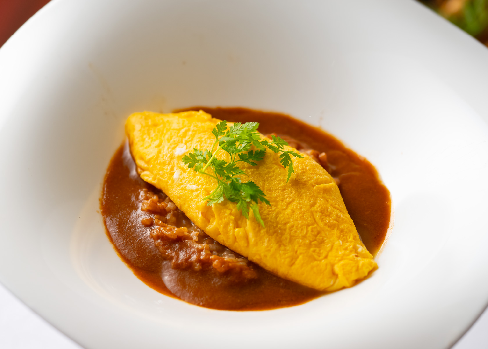 オムレツを割り広げて、おじやとともに贅沢にお召し上がりください。