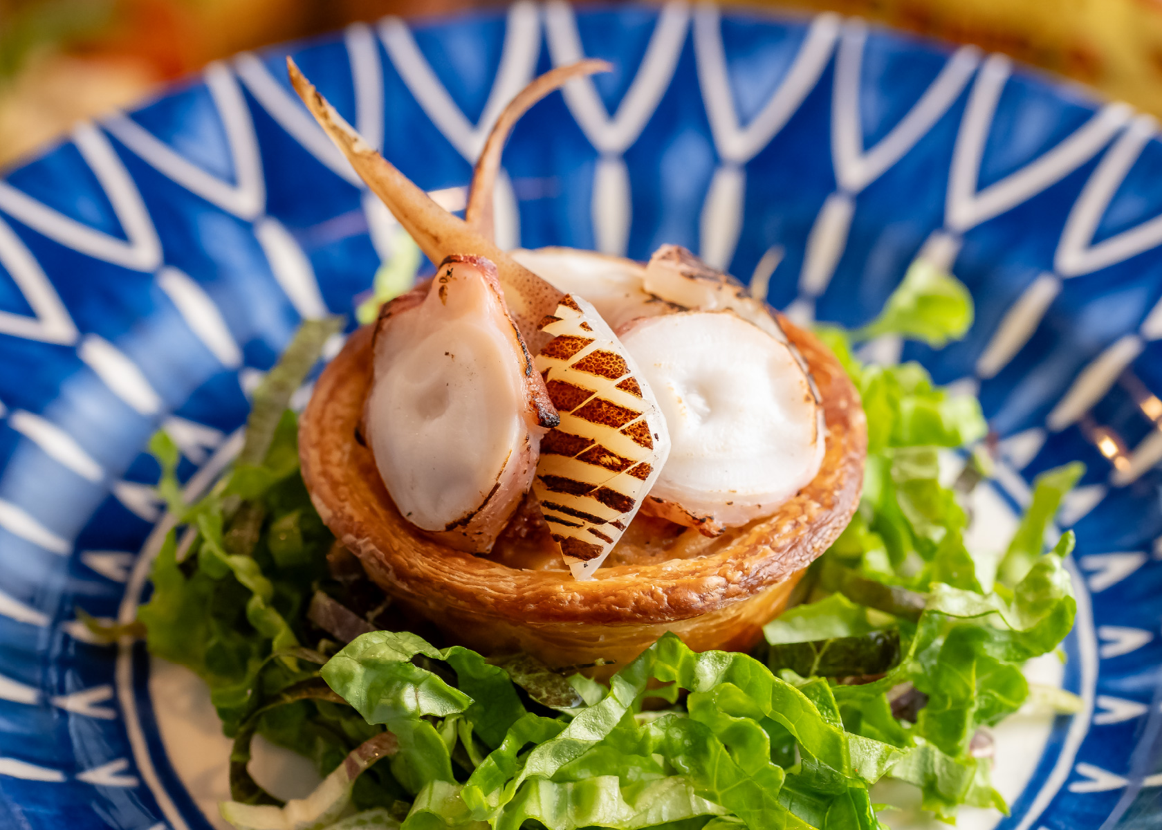ポルトガルのお菓子「パステル・デ・ナタ」の折りパイ生地を使用し、八戸魚介とともに焼き上げ、パリッとした食感の温かい前菜に仕立てました。