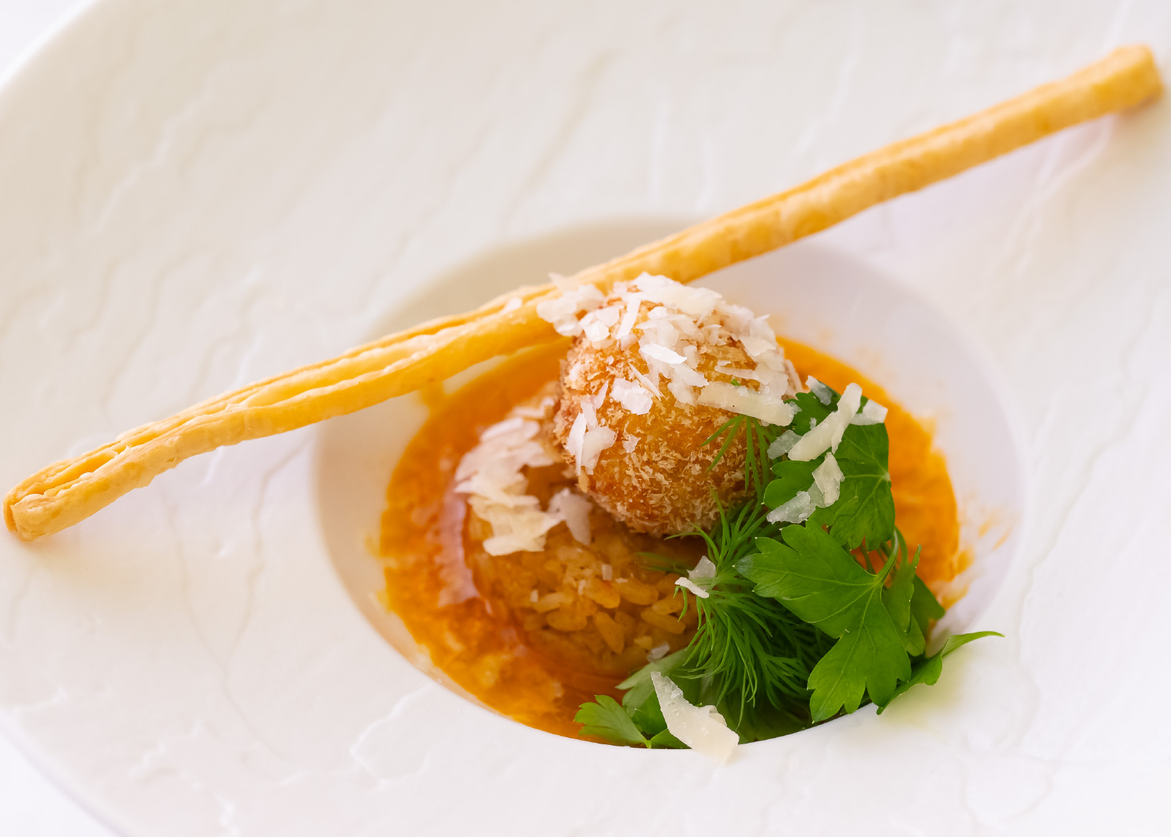 魚介の旨味たっぷりのブイヤベーススープをカニの出汁で炊いたビスクライスにかけ、洋風おじやに。