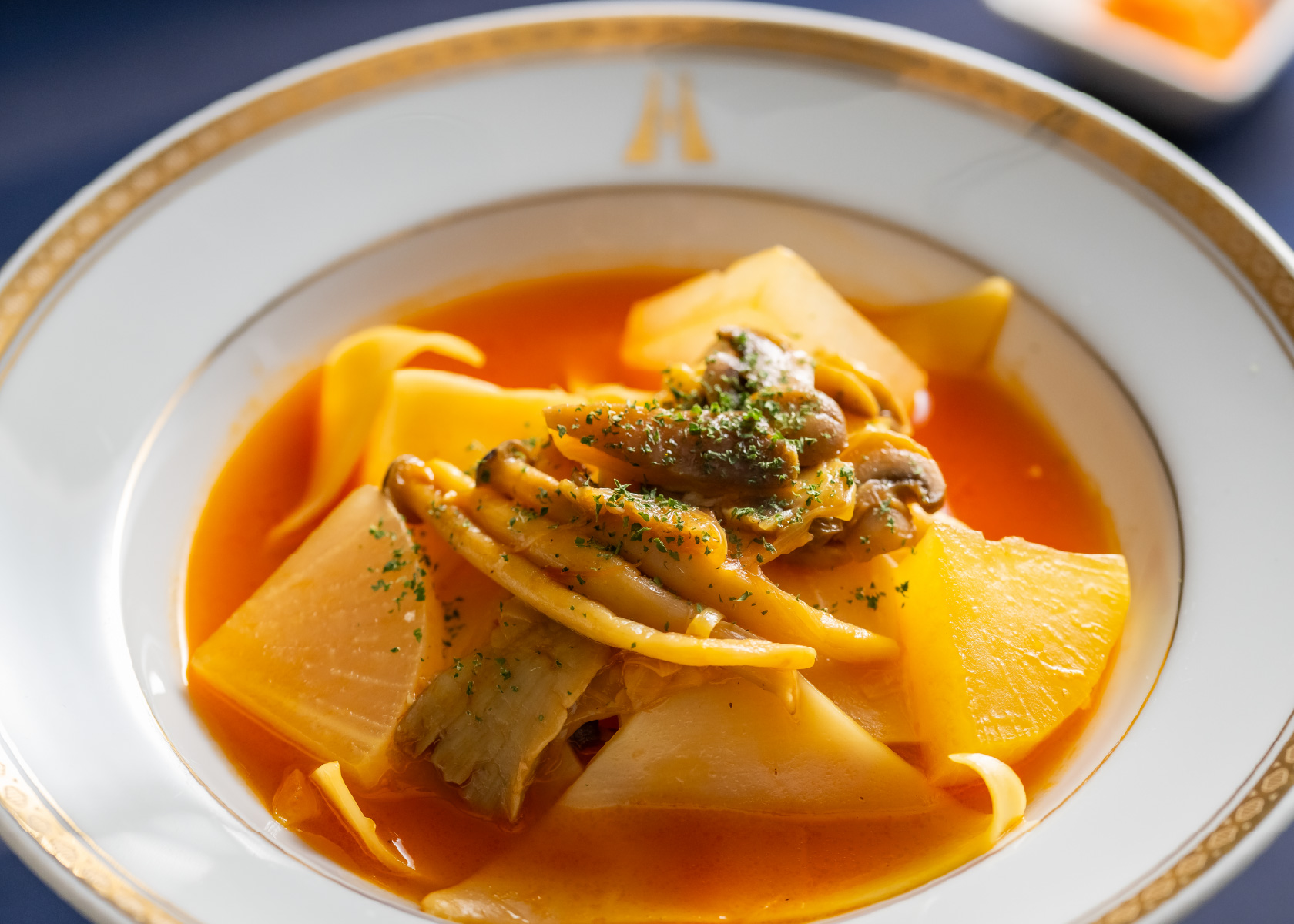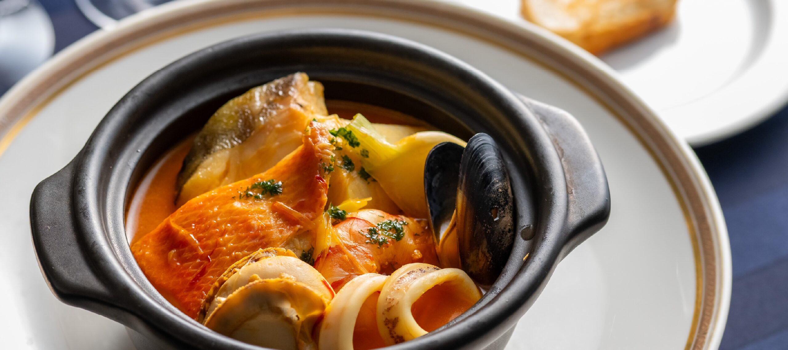 火加減を調節しながら丁寧に煮てクリアに仕上げたスープは、具材の魚介それぞれの個性、味わいを大切に活かします。