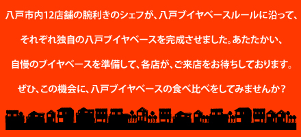①八戸産の魚介類をふんだんに使用! 八戸港に水揚げされる新鮮な地元産の魚介を少なくとも4種類以上使います。 ②八戸流は二度おいしい! まず、魚介(具材)のおいしさを十分に味わっていただきます。次に、各店が工夫を凝らした食べ方で、スープの旨みをお楽しみいただけます。 |