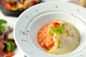 ブイヤベーススープで仕上げたリゾットにホテル特製ベシャメル(ホワイト)ソースをかけて焼き上げた熱々のドリアをお召し上がりください。