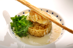 カニのビスク(濃厚なスープ)で炊いたバターライスにスープをたっぷりかけておじや風に召し上がれ。