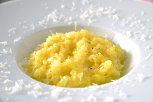 魚介の旨味がしみ込んだスープを少し残しておいて、サフランで炊いたリゾットを加えていっしょにお召し上がりいただきます。