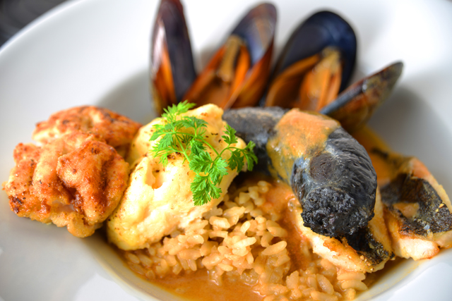 ブイヤベースの具材には旬の魚介、自家製いか墨ソーセージ、白身魚のクネルに五戸町産のお米「おぼろづき」を使ったリゾットを添えます。