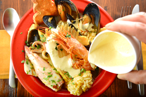 マルセイユの「海の料理」ブイヤベースに、特製のアイオリソースをたっぷりと混ぜると、プロヴァンスの「山の料理」ブーリッドに変化します。