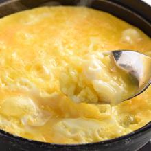 卓上でスープを温め、ご飯を入れてリゾットに。仕上げに卵でとじてオムライス風に、お召し上がりいただきます。