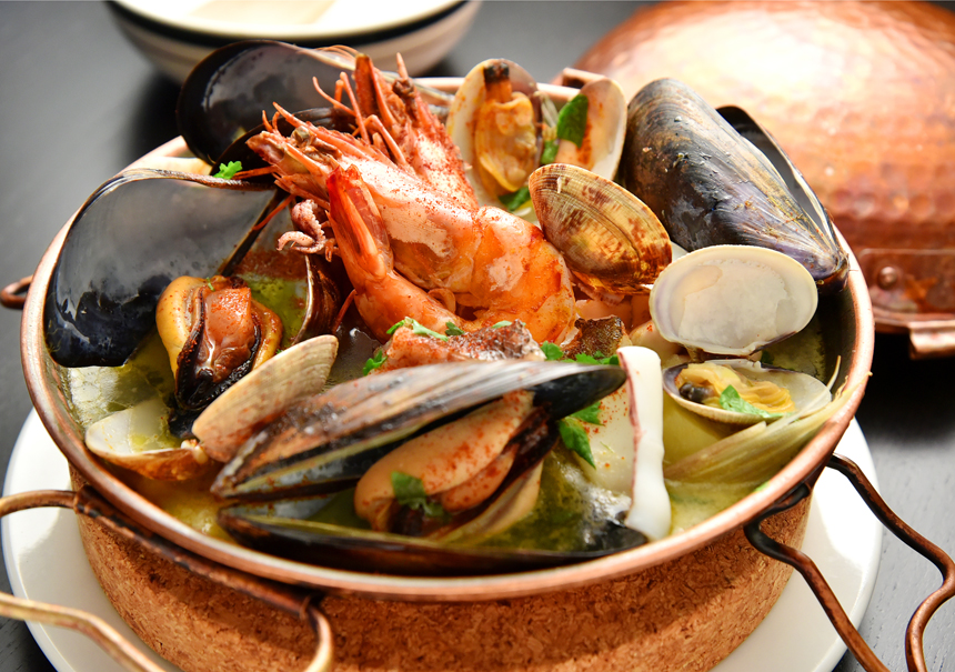 蓋を開けると湯気の向こうには山盛りの魚介類。魚介の味を最大限いかしたコリアンダーとパプリカがきいた白ワイン風味のシンプルながら異国情緒溢れる豪快な一鍋です。