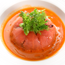 ブイヤベーススープで古代米を炊いてピラフにします。ピラフをトマトに詰めてお出しします。