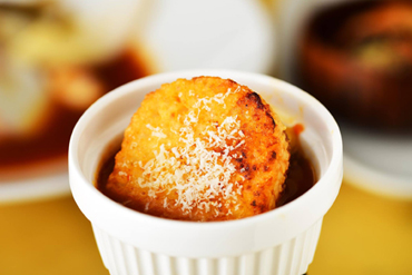 スープにカニの風味を加えた濃厚なスープでお米を炊き上げます。仕上げにカリッと焼き上げて、カリカリ、モチッとした食感に。チーズをふりかけて。