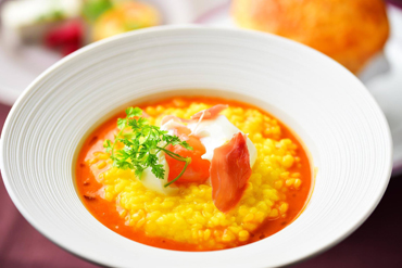 ブイヤベーススープで仕上げた鮑リゾットを生ハムと半熟卵とともに。黄味がトロリと溶け出します。卵かけごはんのイメージでお召し上がりください。